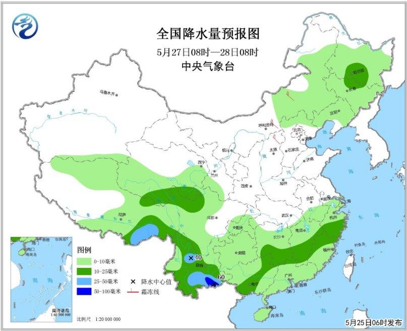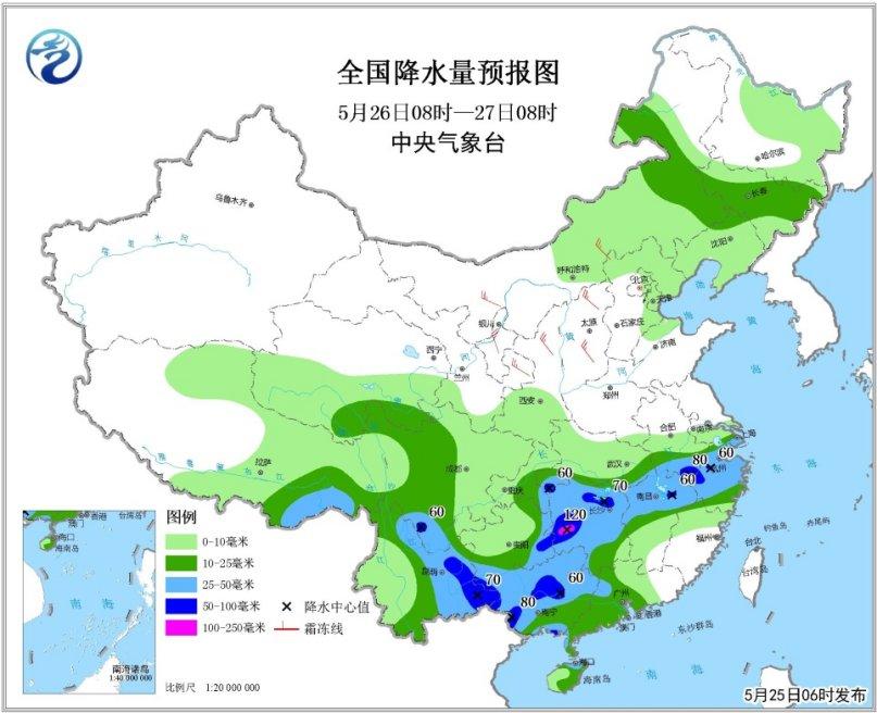 全国降水量预报图(5月25日08时-26日08时)