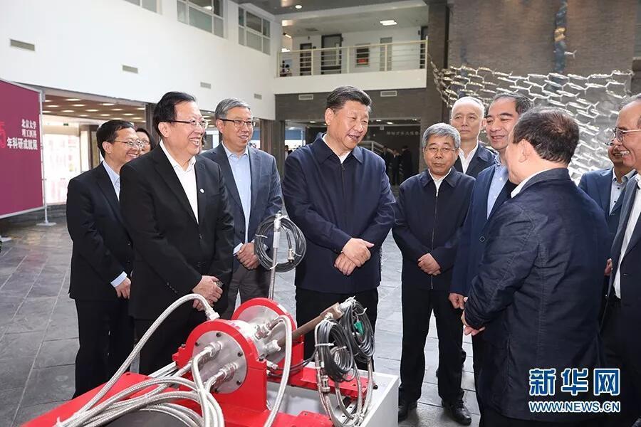 2018年5月2日,中共中央总书记、国家主席、中央军委主席习近平来到北京大学考察。这是习近平在北京大学金光生命科学大楼一层大厅认真听取关于学校学科建设、人才队伍建设、科研创新能力提升等情况介绍。