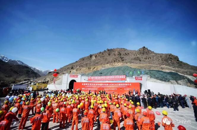 这是2016年2月27日在乌兹别克斯坦安格连—帕普铁路卡姆奇克隧道出口拍摄的全隧贯通仪式现场。新华社记者沙达提 摄