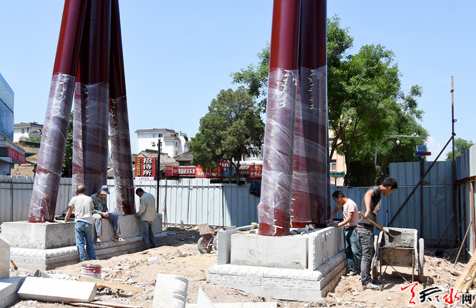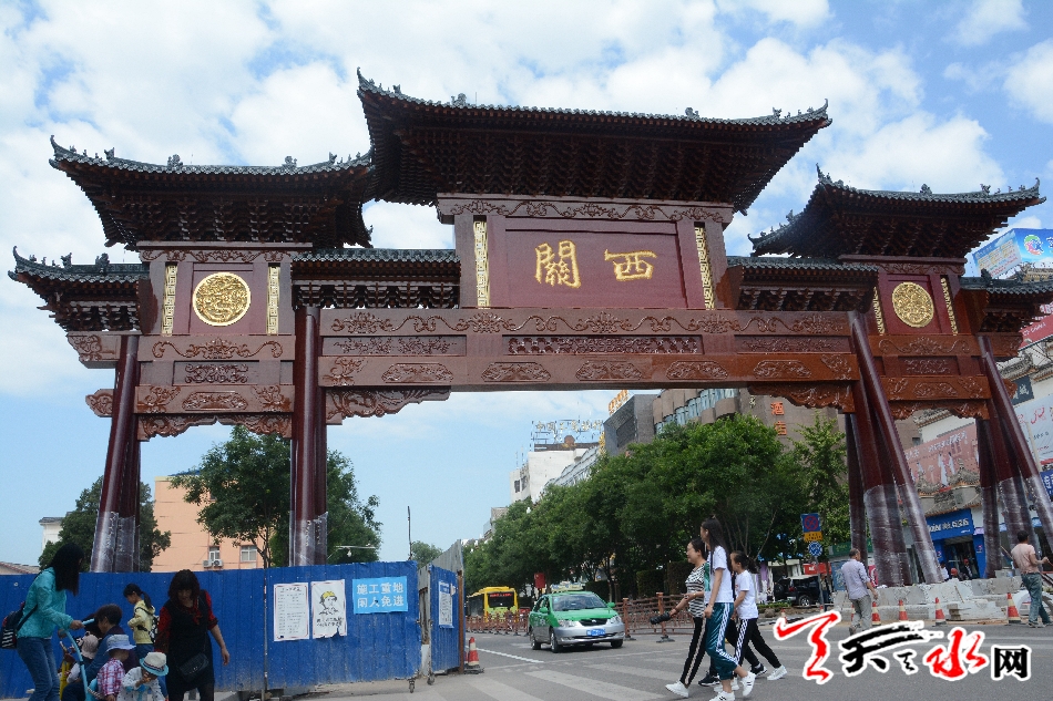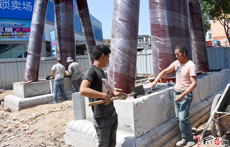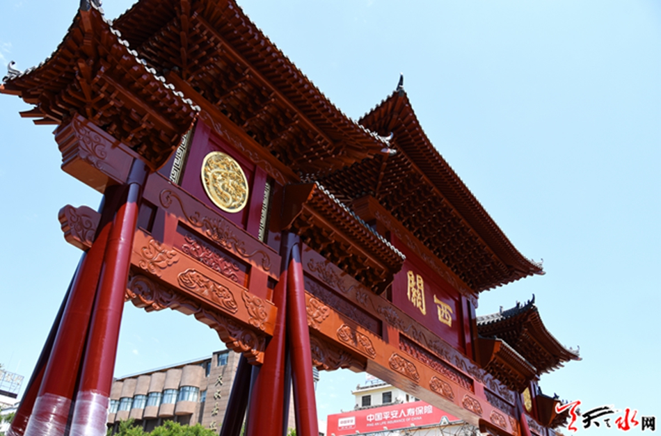 6月10日,记者在秦州区解放路东口看到,解放路西关仿古牌坊主体已基本建成,施工人员正在进行底座建设等扫尾工程,为节会营造了浓厚氛围。解放路西关仿古牌坊,工程总投资520万元,总跨度27.4米,总高度18米,建筑格式为三间四柱七楼,为明清建筑风格。造型设计古朴典雅、简洁大气,旨在彰显天水古城的历史感和厚重感,突出天水古民居建筑特点和优势,建成后将成为一处新的具有浓郁天水地方特色的景点。