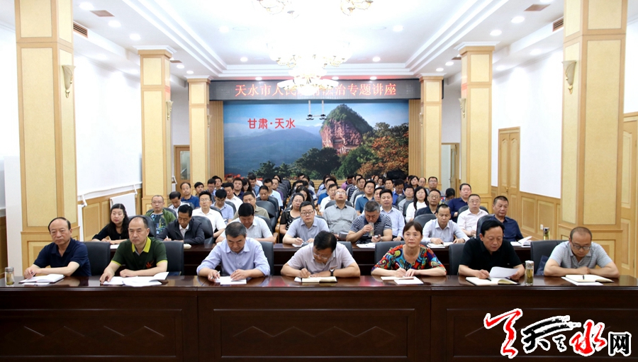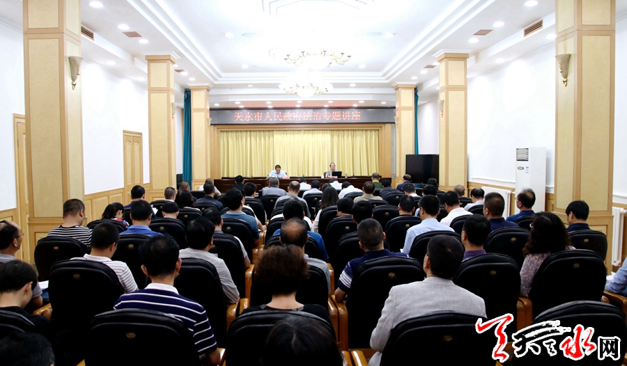 天天天水网讯【记者童强】6月14日,市政府举办2018年度第一期政府系统领导干部法治专题讲座。旨在全面贯彻落实中央、国务院《法治政府建设实施纲要(2015-2020年)》《中华人民共和国宪法》《中共中央关于深入学习宣传和贯彻实施<中华人民共和国宪法>的意见》(中发[2018]10号),推动领导干部加强宪法学习,增强宪法意识。