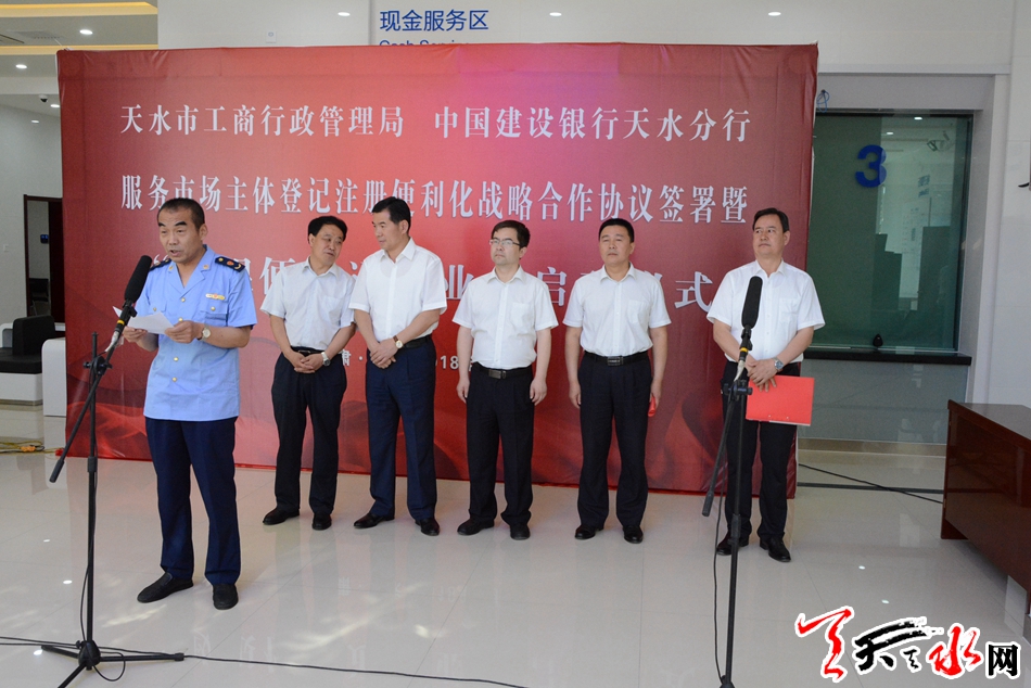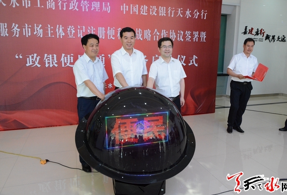 天天天水网讯【记者马哲】6月14日,天水市工商行政管理局与建设银行天水分行签署了战略合作协议,并在建行天水分行营业室启动“政银便民通”业务。副市长程伟东出席启动仪式,宣布建设银行天水分行“政银便民通”业务正式启动。