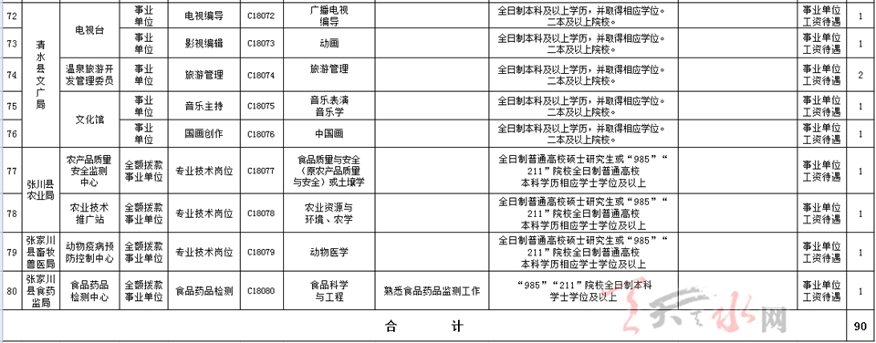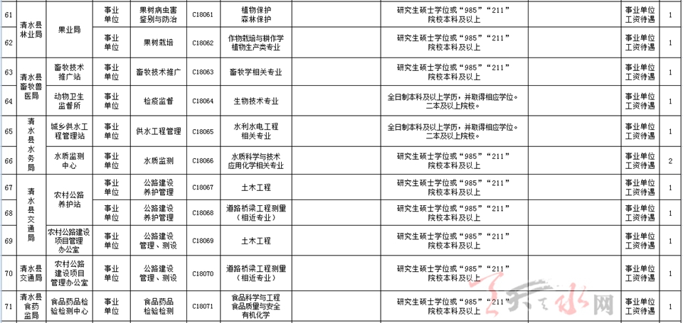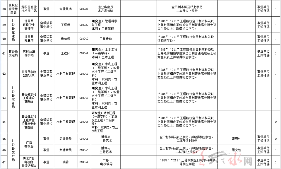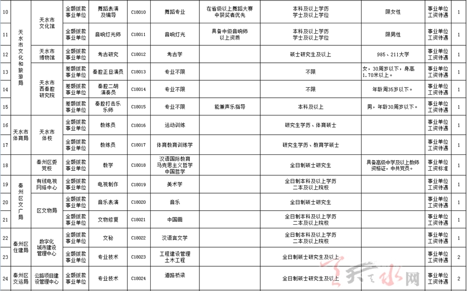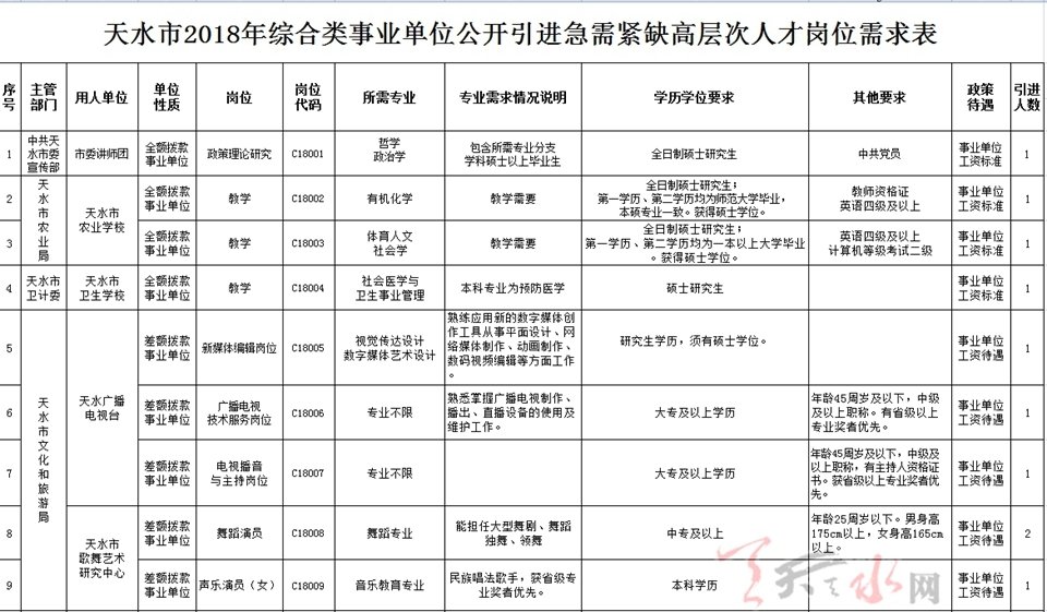 3.2018年及以前毕业的全日制普通高等院校博士、硕士、本科和中级及以上职称人员。具体岗位条件和要求以附件《天水市2018年综合类事业单位公开引进急需紧缺高层次人才岗位需求表》为准;