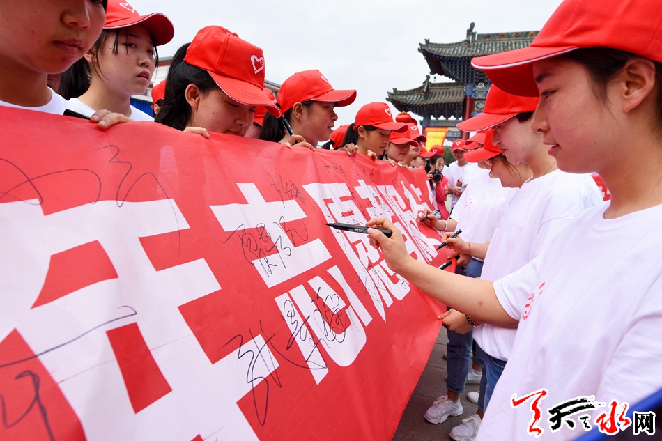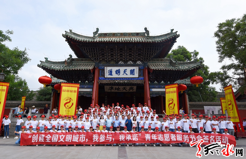 6月19日,节会来临之际,团市委在伏羲城组织开展了全市“创建全国文明城市,我参与、我承诺”青年志愿者服务节会签名活动。