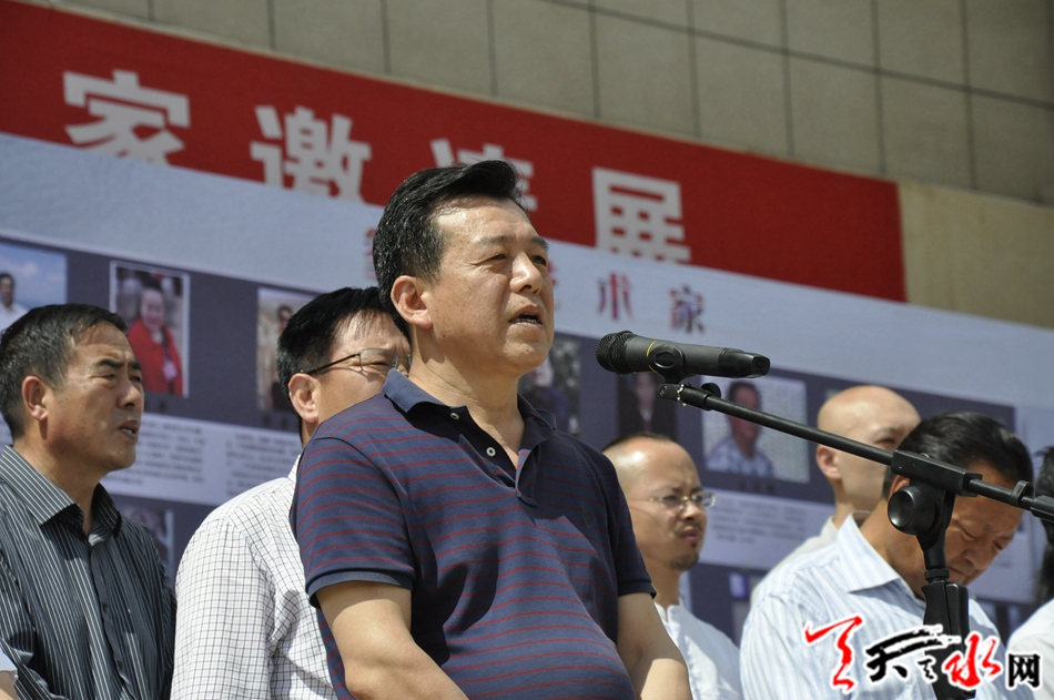 甘肃省文化厅副厅级巡视员王春生,省文化馆馆长陈华平;陕西省美协党组书记、陕西美术事业发展基金会理事长、中美协会员吕峻涛,中美协会员、中国博物馆学会理事刘奇伟,陕西省美协组联部主任、陕西书画院副院长何虎林,西安中国画院院长、西安美协常务副主席、中美协会员王犇,甘肃画院原院长、甘肃省美协副主席、中美协理事康金城,中书协会员、甘肃鑫报社社长杨重琦等陕甘两省书画名家,县直单位干部职工代表、县文联所属协会、部分城区师生代表、书画爱好者近千人参加开展仪式。