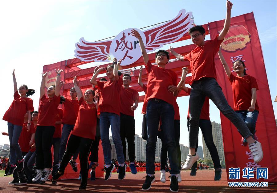安徽淮南市第二中学学生穿越“成人门”(2018年5月4日摄)。新华社发(陈彬 摄)