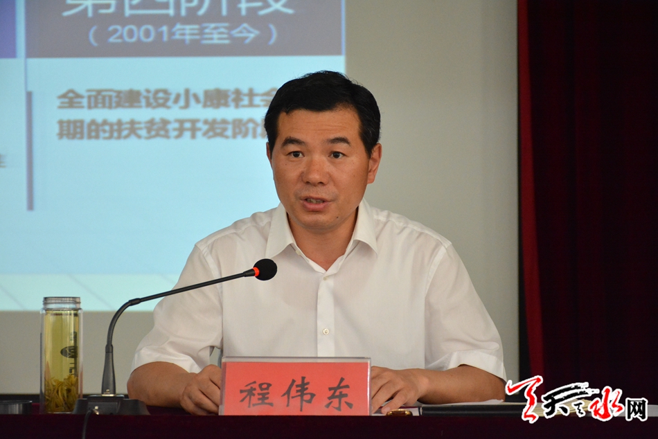 天天天水网讯【记者李欣桐】6月25日,副市长程伟东在全市县处级领导干部学习《习近平新时代中国特色社会主义思想三十讲》暨“七一”党课辅导班上作了题为《深入学习习近平扶贫开发战略思想 以精准举措坚决打赢打好脱贫攻坚战》的专题辅导讲座。