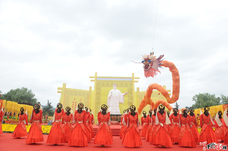 序曲“颂之大德”拉开了乐舞告祭的帷幕,“弥之高仰”“鼓振神州”两个乐章依次恢宏呈现,追思赞颂、拜祭祈福。随后,一条巨龙腾空而起,飞龙在天,润泽天下,祝愿中华文明万世永续,伟大祖国繁荣昌盛,各族人民幸福安康;祝愿清水腾飞、天水腾飞、甘肃腾飞、中华腾飞。