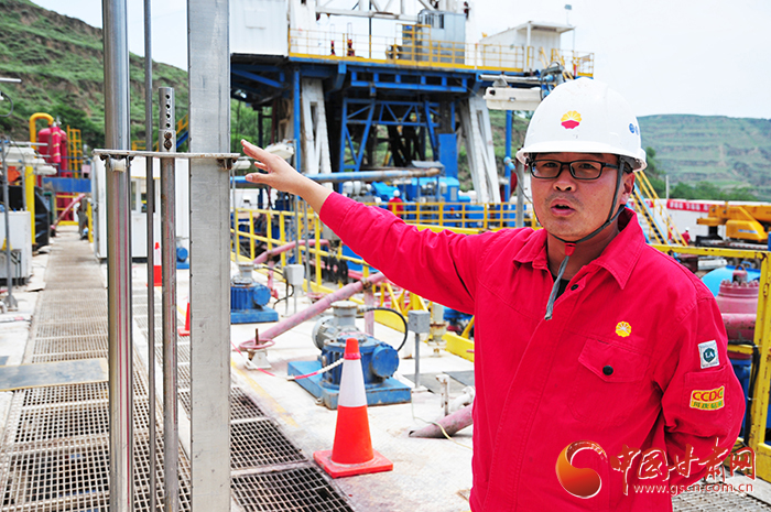7月5日,川庆钻探长庆钻井总公司50285钻井队支部书记赵旭东向记者介绍钻井设备情况。