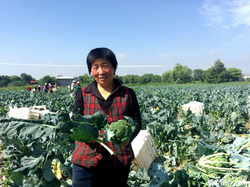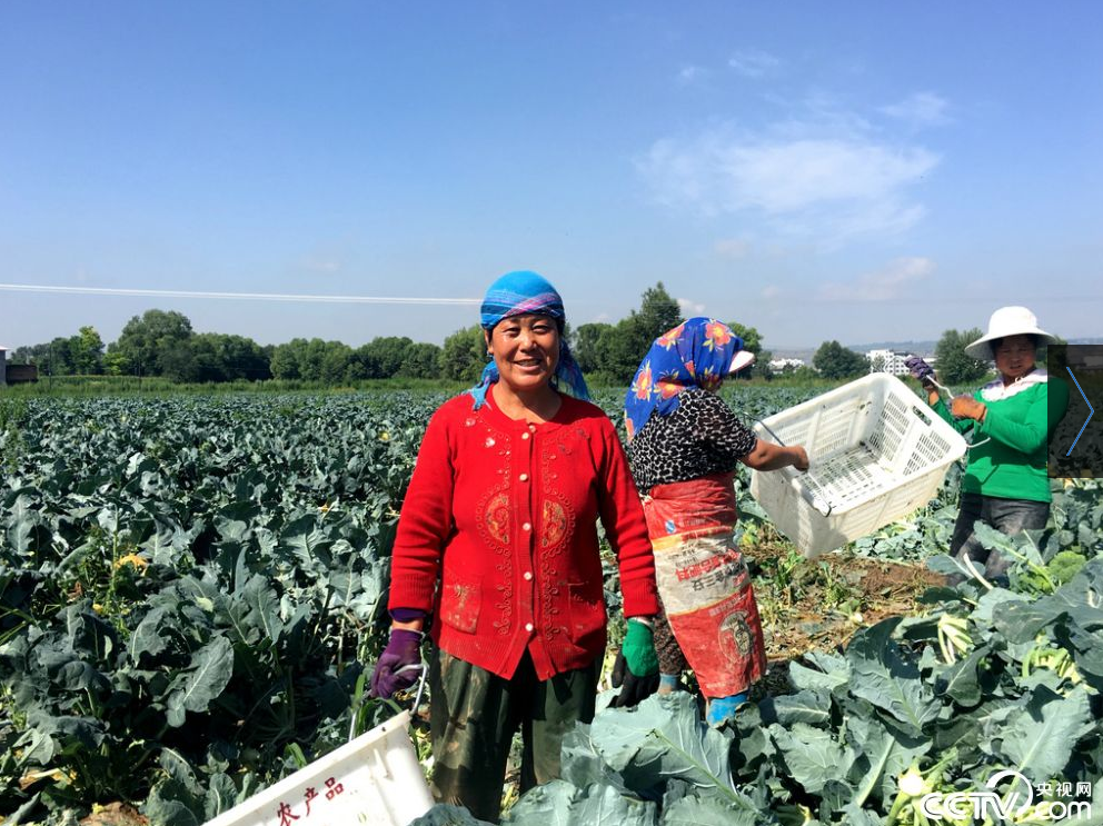 在临夏回族自治州临夏县,56岁的宗月儿(音)将土地流转给公司,并在企业打工,当天,她正在蔬菜基地采摘西蓝花,每天能赚65元。