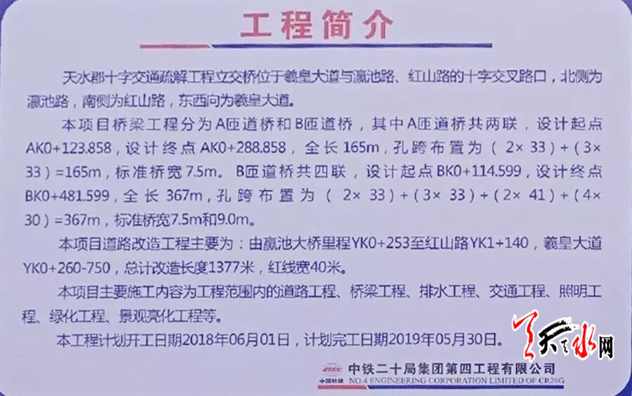 据介绍,秦州区天水郡十字交通疏解立交桥工程位于羲皇大道与瀛池路、红山路的十字交叉路口,北侧为瀛池路,南侧为红山路,东西向为羲皇大道。建设内容包括在羲皇大道新建由东往南左转匝道,宽7.5米,单向单车道;瀛池路新建自北往南直行匝道,其中瀛池路段宽7.5米,单向单车道,过交叉口后左转匝道汇入,形成单向双车道匝道,宽9米,在红山路落地。同时对羲皇大道、瀛池路局部路段拓宽改造,改造长度分别为580米、922米,宽度40米。整个工程计划于明年5月30日完工。