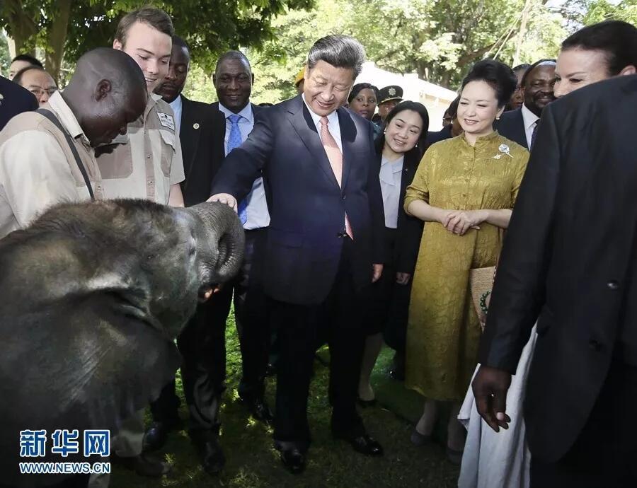 2015年12月2日,国家主席习近平在津巴布韦考察野生动物救助基地。在基地负责人陪同下,习近平和夫人彭丽媛察看了基地救助的野生动物,并给大象、长颈鹿递喂水果、树叶。 新华社记者 兰红光 摄