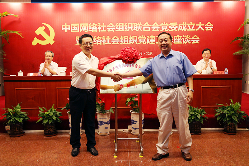 中央网信办副主任高翔和全国人大社会建设委员会副主任委员、中国网络社会组织联合会会长任贤良共同为中国网络社会组织联合会党委揭牌。高海涛 摄