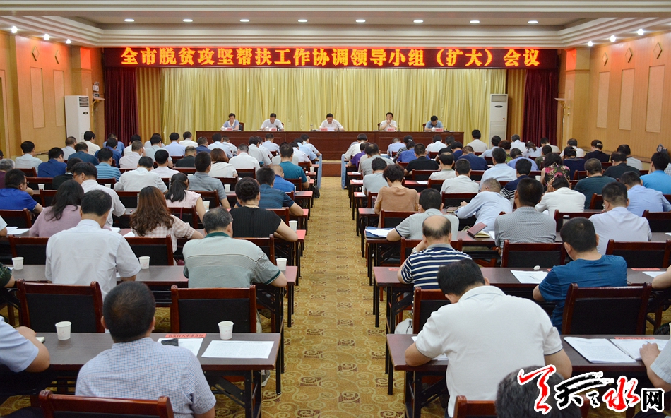天天天水网讯【记者胡丽霞】7月20日,全市脱贫攻坚帮扶工作协调领导小组(扩大)会议召开。会议贯彻落实中央、省委省政府关于脱贫攻坚帮扶工作的新部署、新要求,分析研判当前脱贫攻坚帮扶工作态势,进一步动员全市各级帮扶单位和帮扶干部统一思想,明确帮扶任务,靠实工作责任,以更务实的举措深入推进脱贫攻坚帮扶工作。 市委副书记赵卫东出席会议,市人大常委会副主任宋建平主持会议。