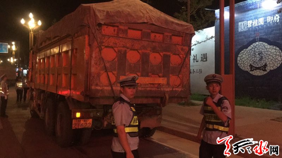 天天天水网讯【通讯员 沈彦斌】7月24日晚9时,由市大气办、区执法局、区环保局、区运管局、城区交警大队、环卫处等相关部门组成联合执法队伍,对城区内建筑工地渣土运输车辆未按规定:未密闭运输、沿途遗撒、带泥上路行驶、乱倾乱倒等污染环境的违规、违法行为进行了夜间查处。