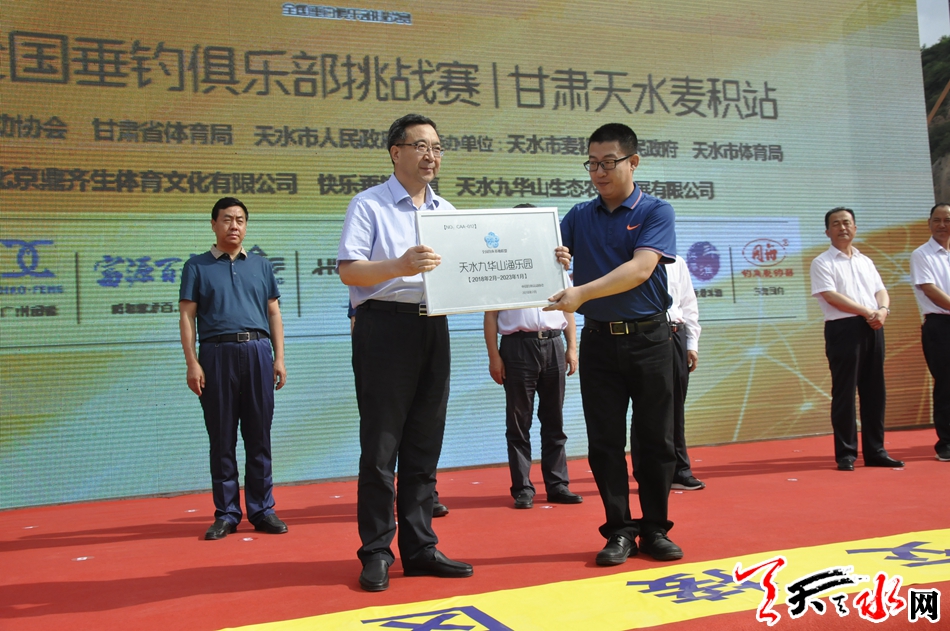 开幕式上,苏宝生为麦积区授牌“全国钓鱼基地联盟单位”,马惠英为麦积区交接了赛旗。