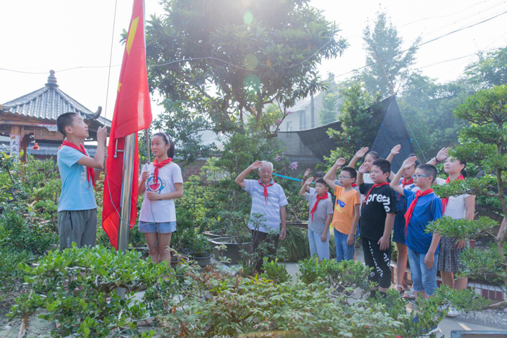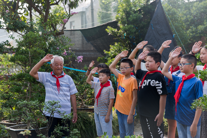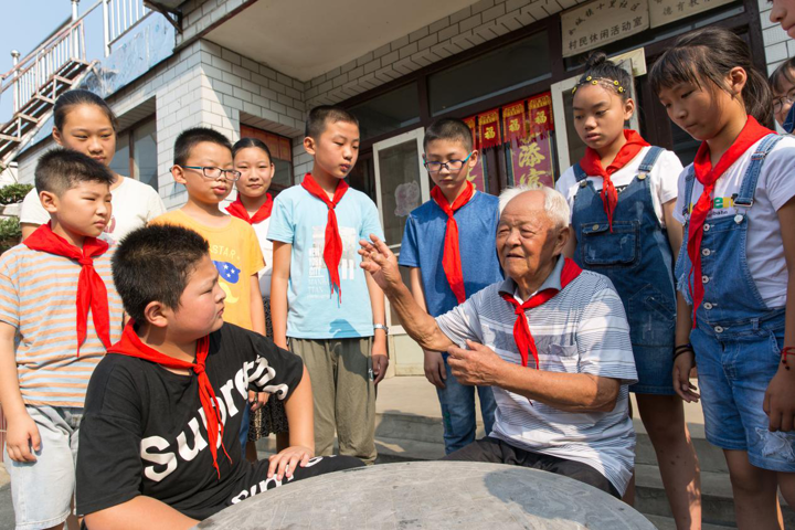 孩子们在江苏南通如皋市如城街道十里社区陈强家进行“我听老党员讲抗日战争故事暨庄严升国旗”活动。