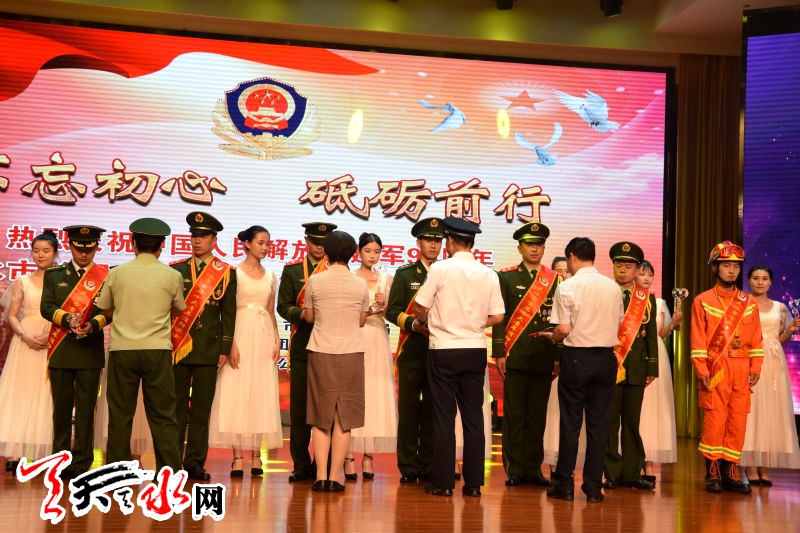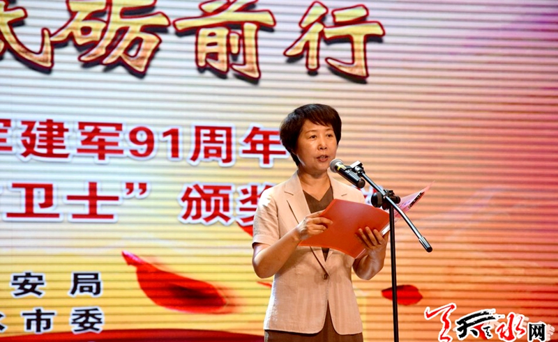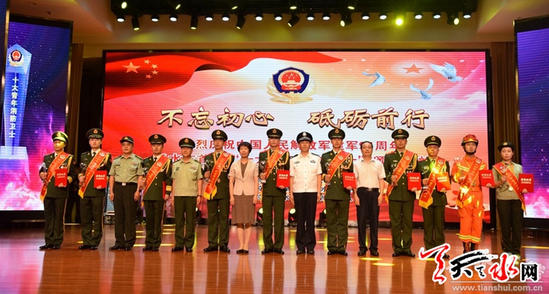 天天天水网讯【记者杨璟】7月31日,由市公安局主办、团市委承办的“不忘初心·砥砺前行”——庆祝中国人民解放军建军91周年天水市首届“十大青年消防卫士”颁奖典礼在天水宾馆举行。省公安消防总队副总队长杜超仁,天水军分区政委袁敬伟,市领导王晓琴、马瑛、郭明兴出席颁奖典礼。