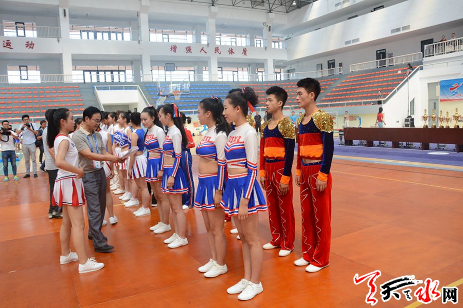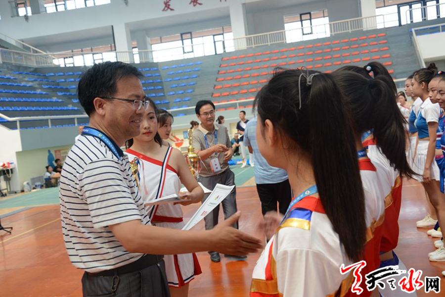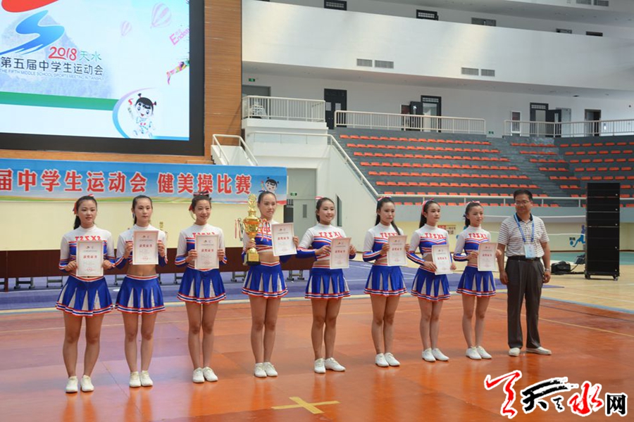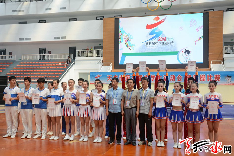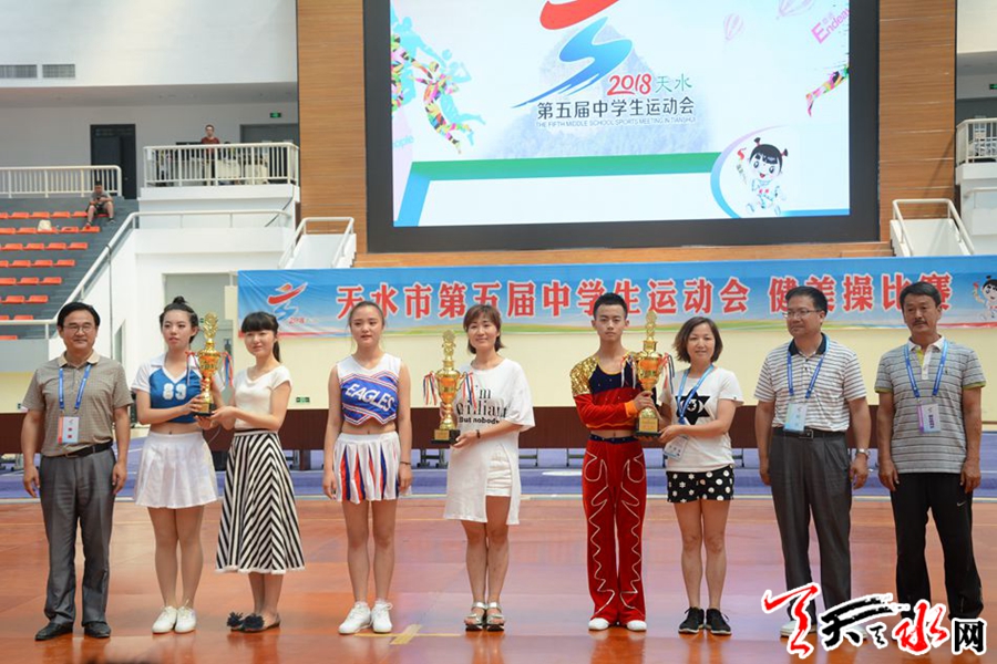 天天天水网讯 8月6日上午,2018年天水市第五届中学生运动会健美操项目完成所有比赛后圆满结束,并在天水一中麦积校区举行颁奖仪式,天水一中校长李强、党委书记秦为群、天水师范学院教授蔡智忠、市教育局体育科科长陈光平为各获奖选手、代表队进行了现场颁奖。