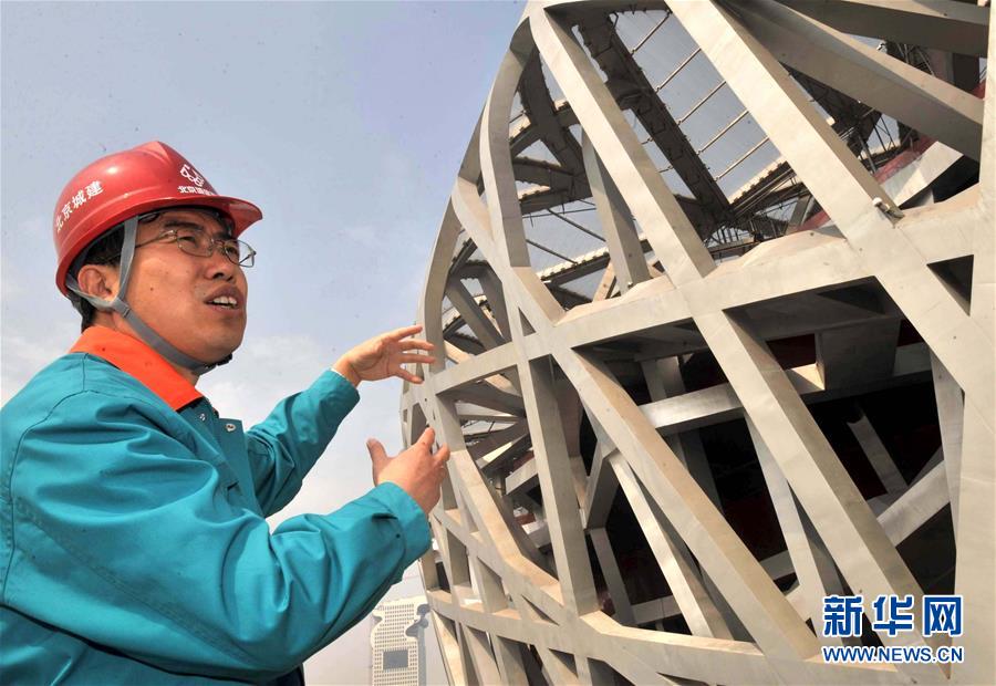 这是2008年4月11日,北京城建集团国家体育场工程总承包部总工程师李久林在“鸟巢”施工现场。 新华社记者罗晓光摄