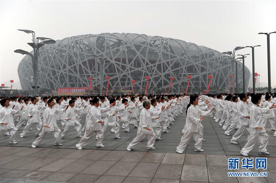 这是2009年8月8日,34000人在“鸟巢”前进行太极拳表演,庆祝全国首个“全民健身日”。 新华社记者郭勇摄