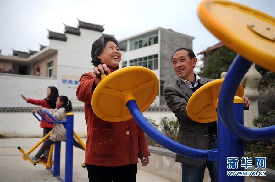 这是2014年3月15日,陕西平利县城关镇居民周桂昌(右二)在药妇沟社区健身。 新华社记者陶明摄