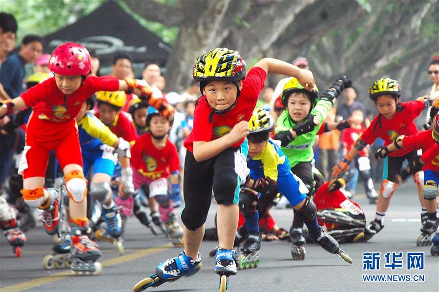 这是2007年5月28日,小选手在杭州西湖白堤举行的第三届青少年环西湖轮滑邀请赛上追逐。 新华社发(朱引炜摄)