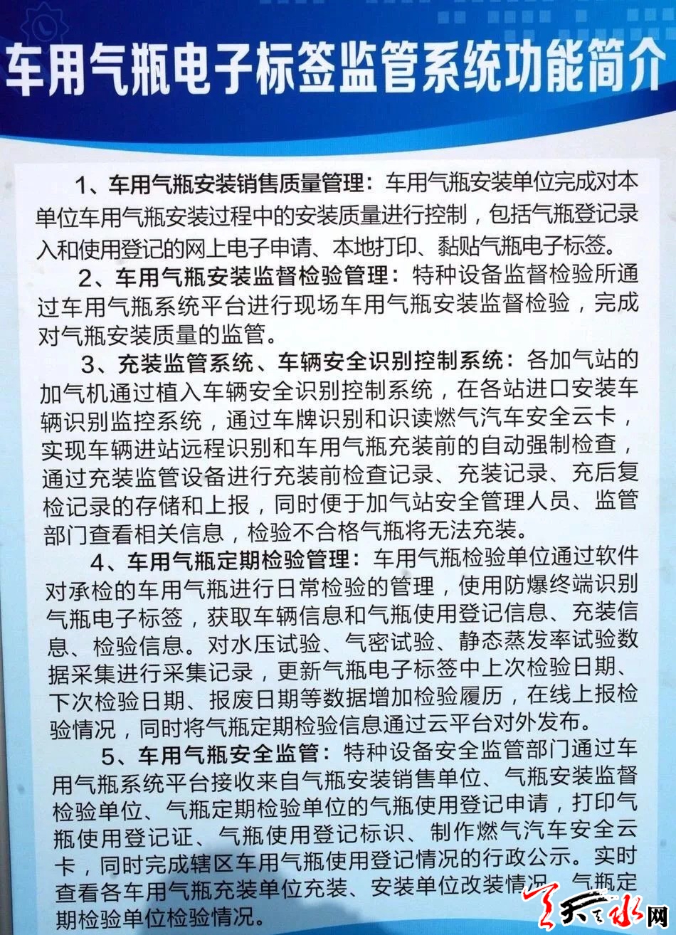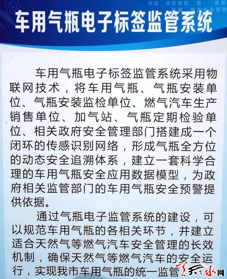 天天天水网讯(记者 马凯)8月7日,天水市车用气瓶电子监管系统启动仪式在天水羲通公交集团举行,标志着我市车用气瓶将实现信息化全动态监管。甘肃省质监局副局长李永平出席启动仪式并讲话。天水市政府副市长王燕宣布监管系统正式启动。