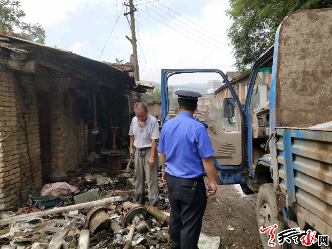 天天天水网讯【通讯员穆芸】8月8日上午秦州区执法局七里墩中队接到群众举报,五里铺枣园庄八公司老家属楼下有废品收购站焚烧废旧物品的行为,造成周边居民生活环境受到污染。