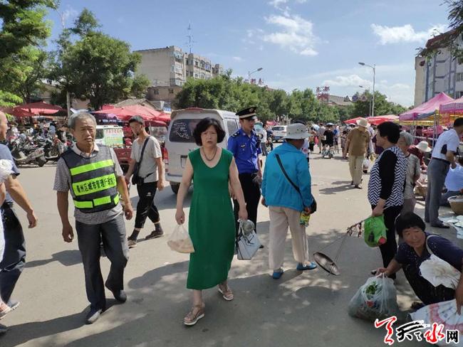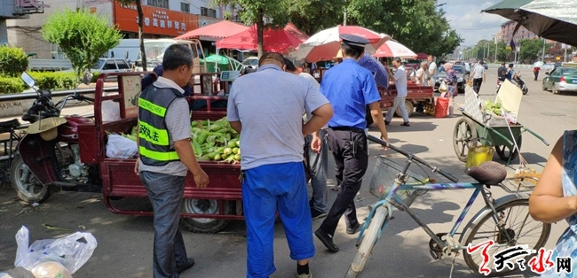 天天天水网讯(通讯员 杨悦莺)占道经营影响道路通行和市容环境,一直以来都是广大群众反映强烈的热点问题,既影响广大市民的公共利益,也是城市管理中的一大“顽疾”。8月12日,秦州区执法局西关中队对辖区内多处市场外占道经营、乱设摊点的行为进行集中整治。在坚家河市场北口,执法人员在执法巡查中发现一处流动摊点,存在占道经营行为,违法情节轻微,为充分体现行政执法以人为本、文明执法理念,执法人员通过以“以劳代罚”的方式代替之前“以罚代管”的方式,让情节轻微的违法者参与文明劝导活动,体验执法人员的执法工作。
