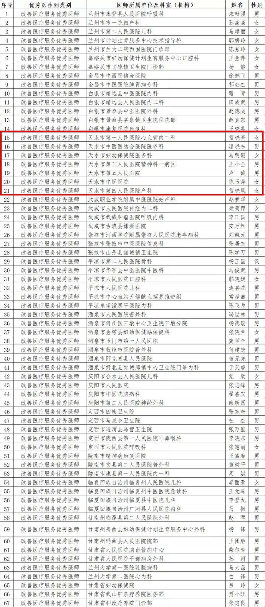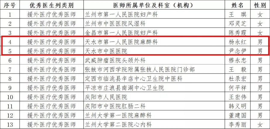 2018年8月19日是全国首个“中国医师节”。根据国家卫生健康委《关于开展首届“中国医师节”活动的通知》(国卫办医函〔2018〕11号)要求,甘肃省卫生和计划生育委员会拟通报表扬一批优秀医师团队和优秀医师。从即日起至2018年8月16日对拟表扬的150个优秀医师团队和500名优秀医师进行公示,如有异议,请与省卫生计生委联系。