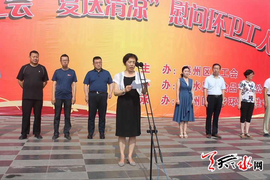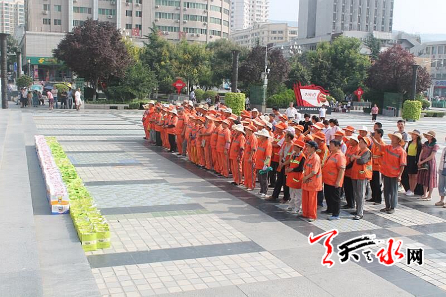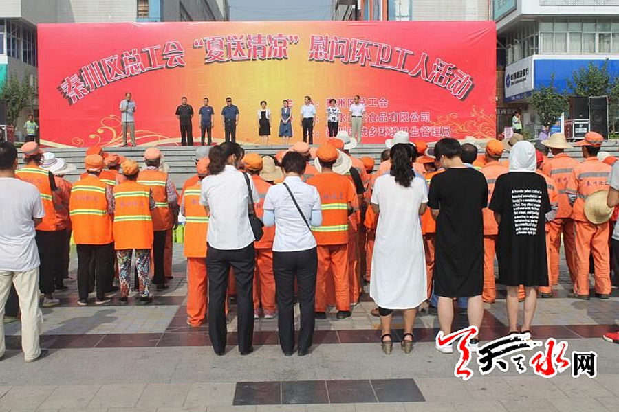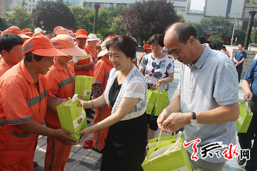 天天天水网讯 8月15日,由秦州区总工会主办,天水昌盛食品有限公司协办,秦州区城乡环卫局承办的“夏送清凉”慰问环卫工人活动在龙城广场隆重举行,秦州区总工会带着200份慰问品专门看望慰问长期奋战在一线的环卫工人。