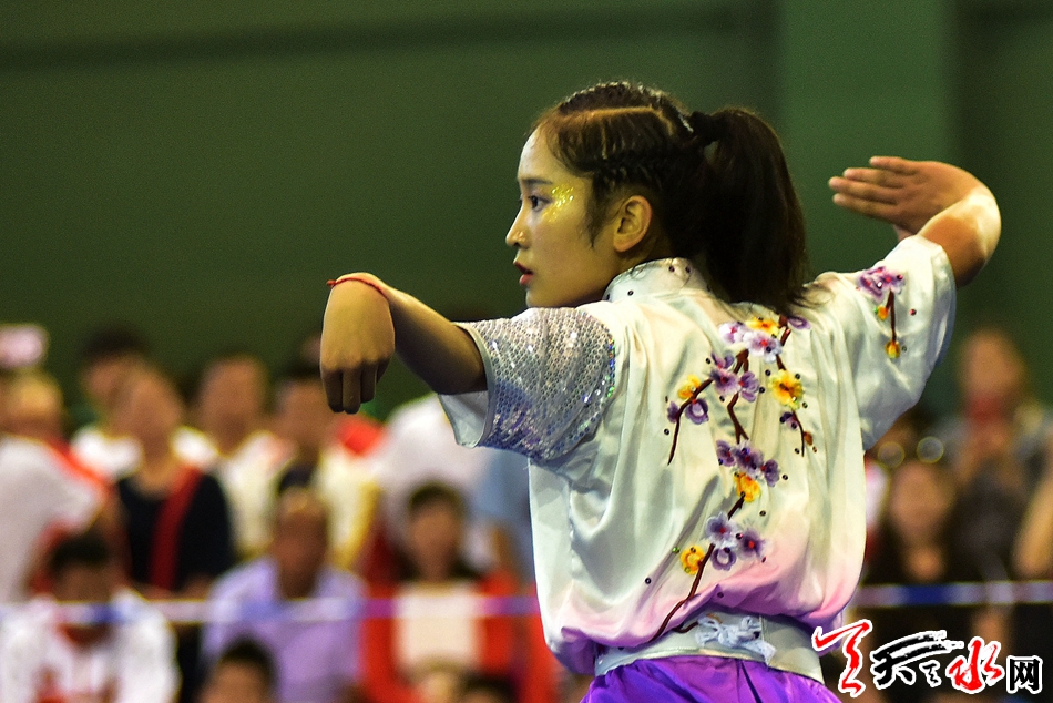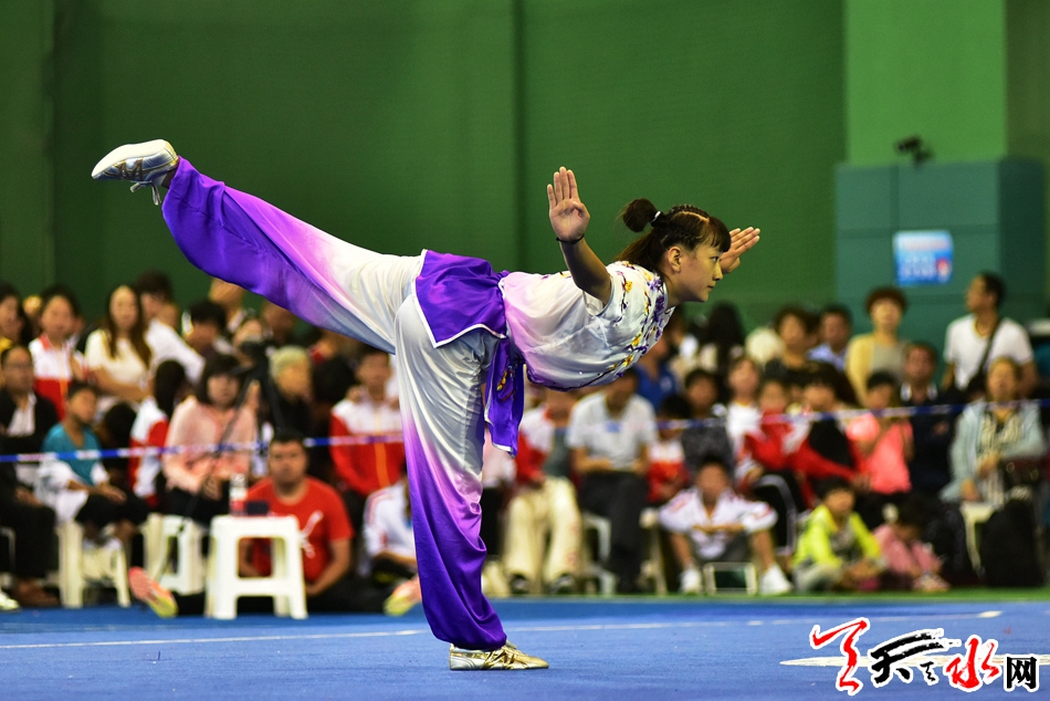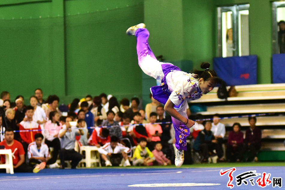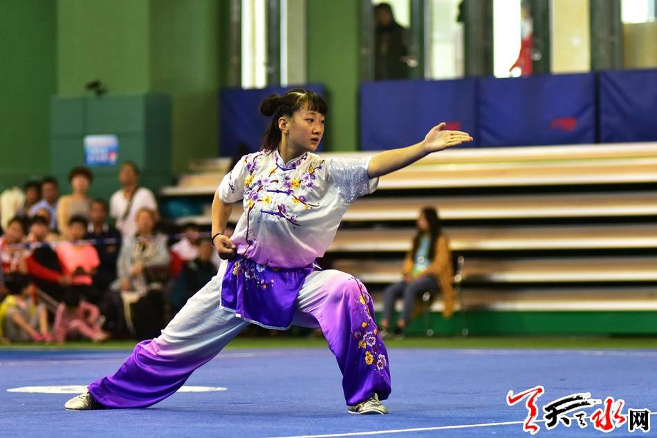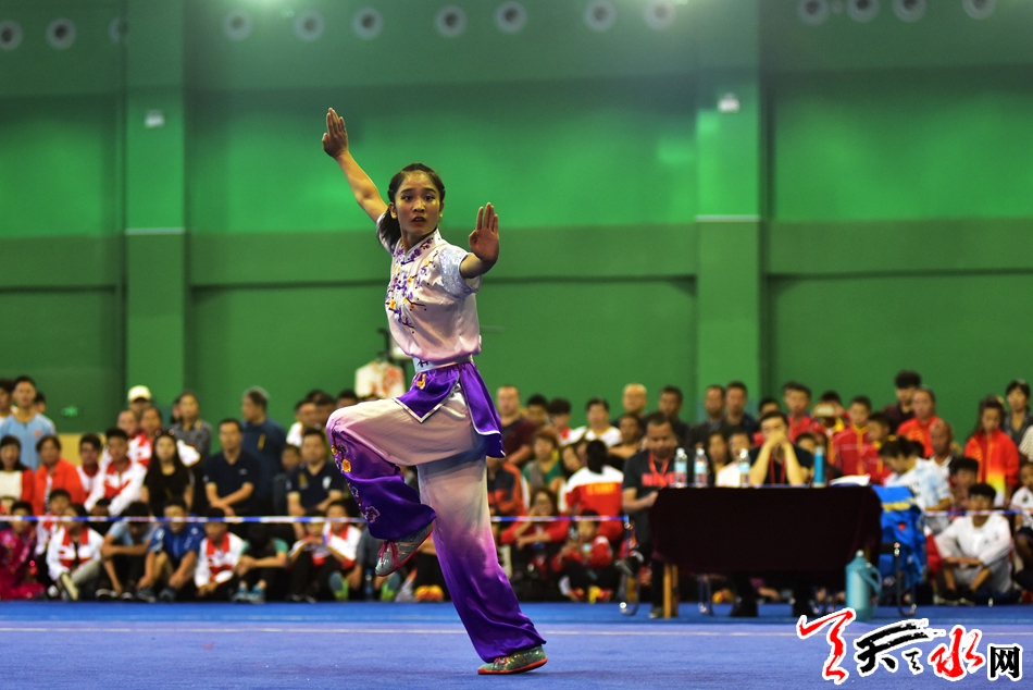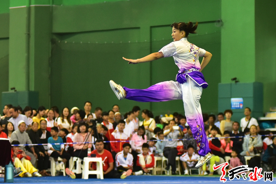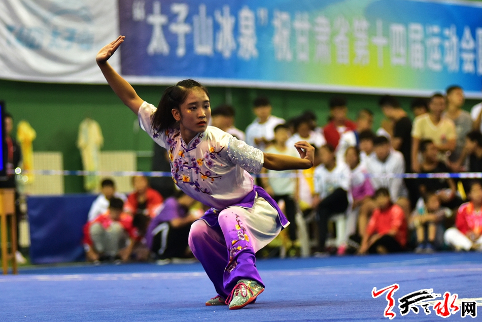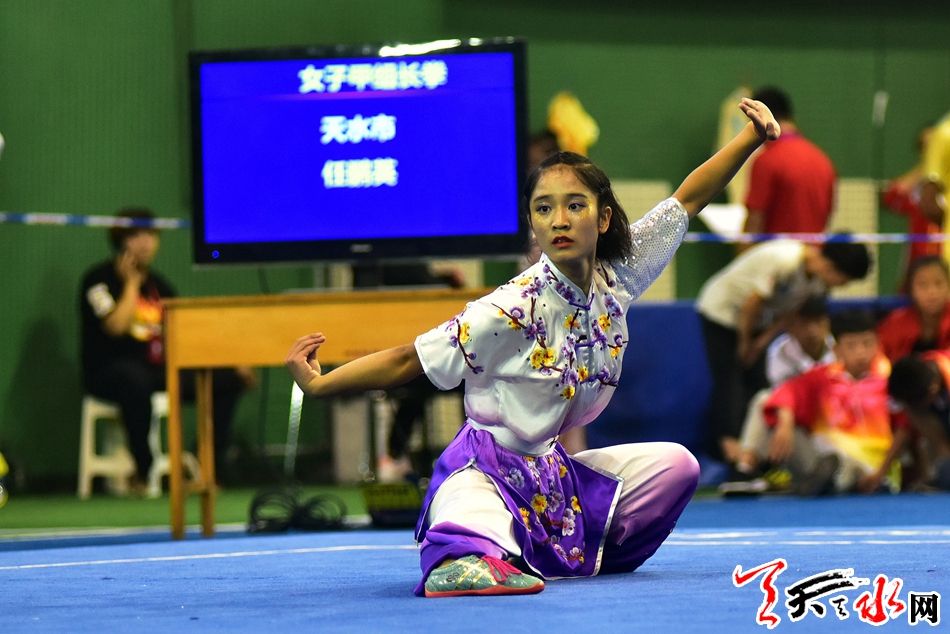 8月19日上午,省运会武术比赛在临夏州全民健身中心开赛,在女子甲组长拳比赛中,市体校的任鹏英获得第二名,第一名被兰州选手夺得。 记者 周文涛 摄