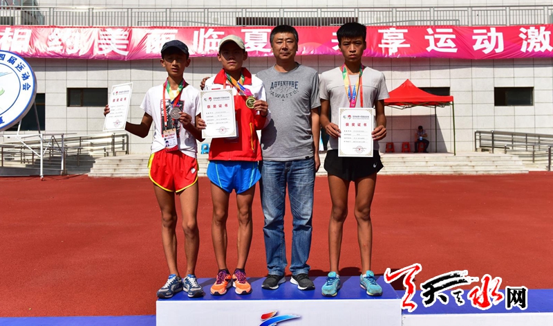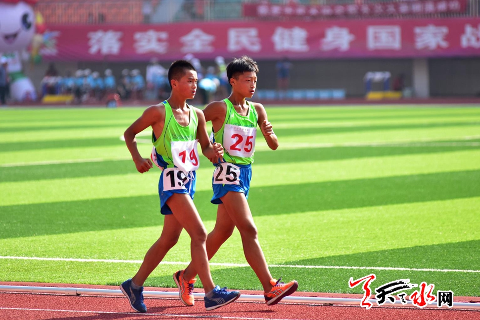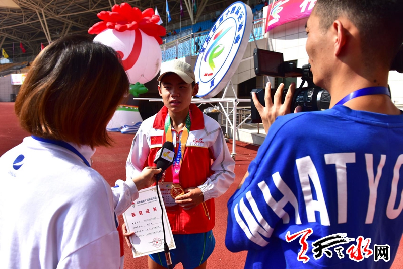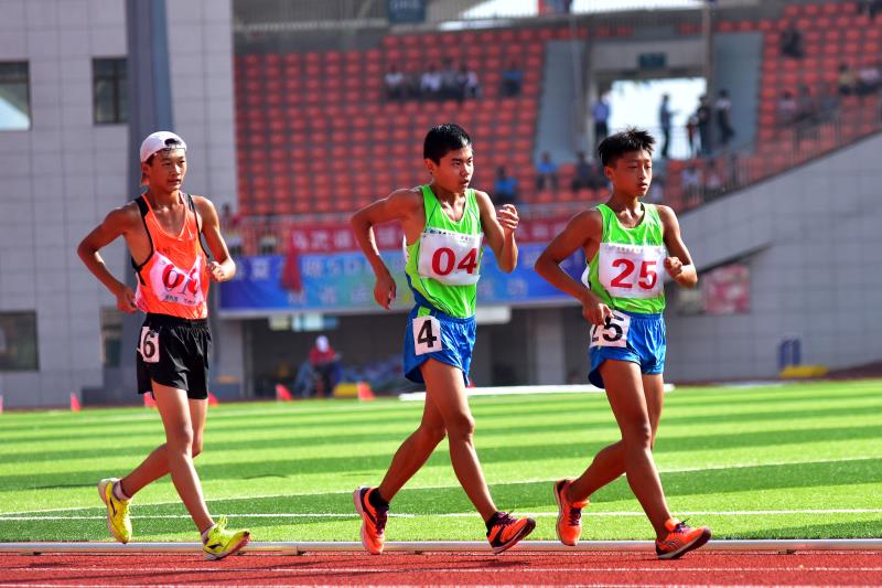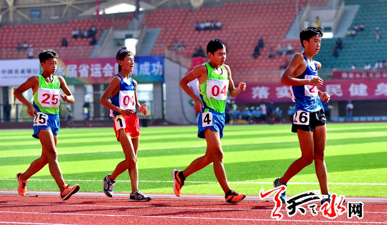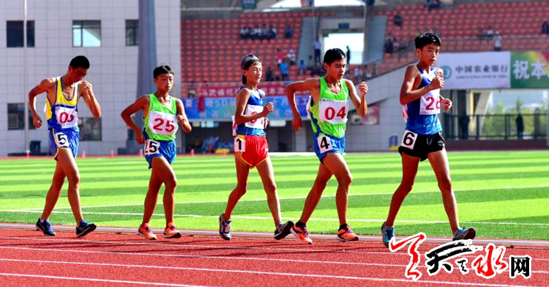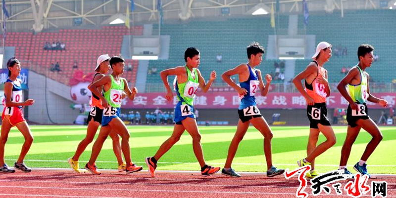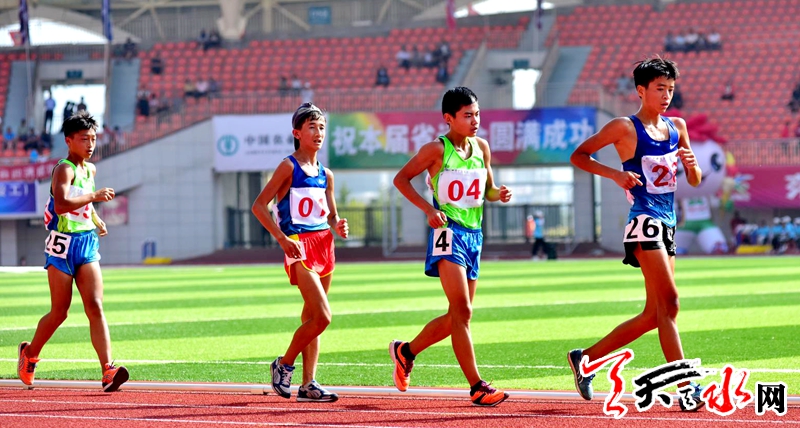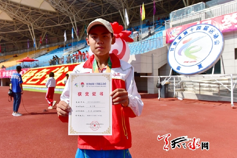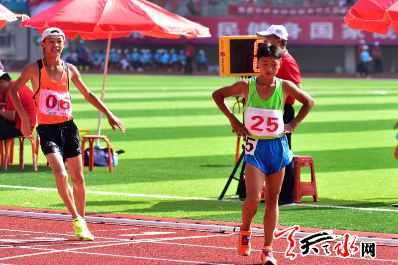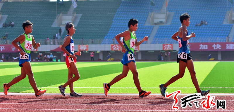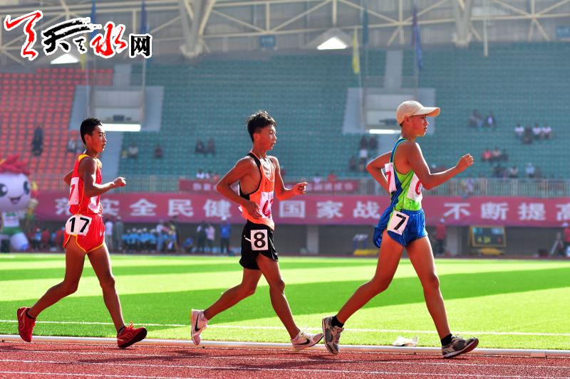 8月20日上午,省运会田径比赛继续在临夏奥体中心体育场进行。在男子乙组10000米竞走决赛中,天水市体校的杨子辉以52分06秒91的成绩夺冠,他还和队友牛文春,马瑞夺得该项目团体金牌。这也是杨子辉继8月18日夺得男子乙组5000米竞走金牌后,在本届省运会田径比赛中夺得的第三枚金牌。记者 周文涛 摄