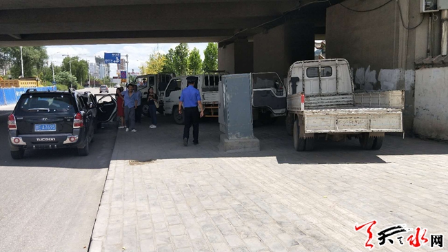 天天天水网讯(通讯员 朱学勇)藉河南路瀛池大桥桥下面人行道是市民出行的必经之道,前期人行道上每天都停放各种货运车等30余辆,把一条长180米的人行道堵塞不堪,出行的人们都要绕着走,极大的给行人带来安全隐患。