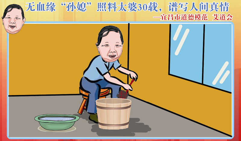 2011年,董婆婆不小心摔了一跤,为此不得不卧病在床休养。几个月里,艾道会做起了专职“护工”:洗澡擦身、洗衣做饭,按时按点,天天如此。董婆婆身上不舒服了,艾道会就给她洗澡擦身体,按时给她翻动身子;董婆婆大小便不能自理,艾道会就给她倒屎倒尿,有时候大小便不小心弄到床上,她会及时换上干净的被褥并仔细清洗。“太婆婆很爱干净,对生活非常讲究,她健康时如此,现在卧病在床就更加应该注意,我们一直尽力保持着她原来的生活习惯,得让她躺着舒心。”艾道会说。