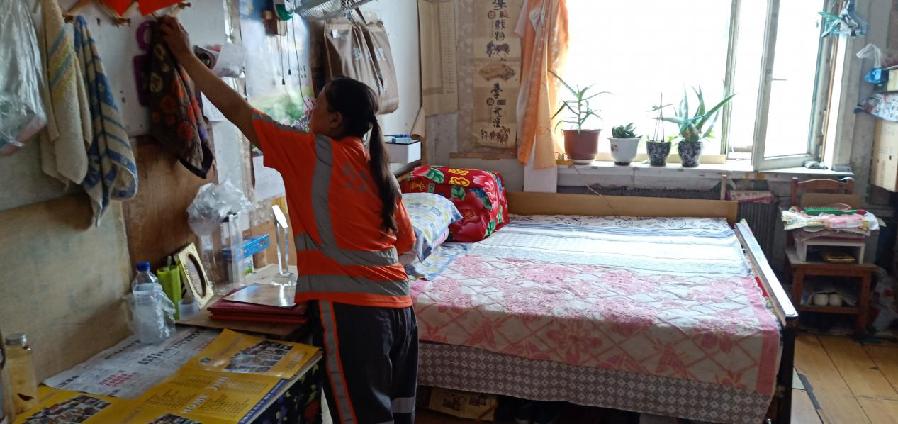 张殿芳正在收拾房间 图片来源:吉林文明网