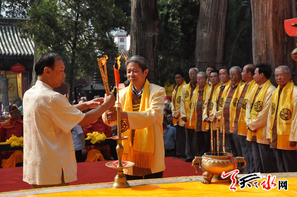 9:35播放《说伏羲》歌曲。天水市伏羲庙管理局局长、天水市民间祭祀伏羲协会执行会长李宁民上香。