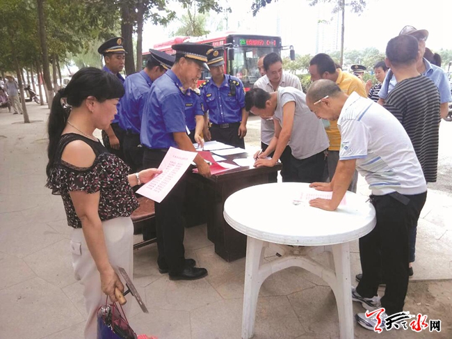 天天天水网讯(记者 洪波) 8月31日,秦州区执法局玉泉中队在职党员来到秦州区石马坪街道南一社区辖区内,开展了“创建全国文明城、在职党员先锋行”志愿服务活动,充分发挥在职党员参与社区建设、服务社区群众的积极作用。活动中,该中队党员向市民发放《市民文明公约》及《调查问卷》等资料,大力宣传创建全国文明城市和城市管理相关知识,积极做好市民的思想动员工作,倡导市民关注全国文明城市创建。