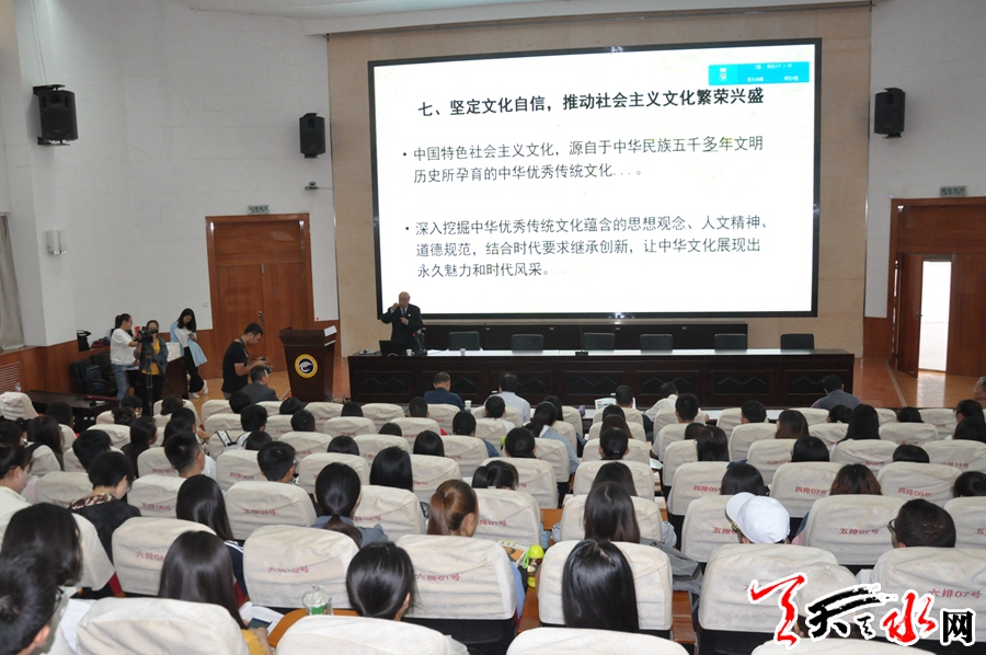 天天天水网讯(记者 刘晓亚)9月5日上午,中华伏羲文化研究会执行会长周宜兴教授给天水师范学院历史文化学院的学子做了《坚定文化自信,确立中华文明的时代定位----坚信中华文明8000年源头在天水》的专题报告,有效的激励了学子们热爱历史、学习历史的热情,也深深的激发了学子们对中华文明的文化自信。