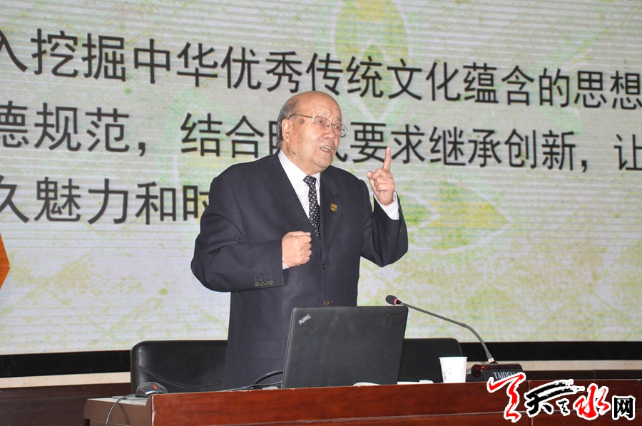 文化是一个国家、一个民族的灵魂。古往今来,世界各民族都无一例外受到其在各个历史发展阶段上产生的精神文化的深刻影响。要树立民族的文化自信,就要学习、研究自己民族的文化渊源和发展,就要学习、研究自己民族的历史和文化发展,为了激励学子们的文化自信,9月5日,80岁高龄的中华伏羲文化研究会执行会长周宜兴教授给天水师范学院历史文化学院的学子就中华文明8000年的发展进行了科学、严谨、详实、生动的讲解,周宜兴教授从学术的高度,以一个学者的态度,从确立中国远古文明的五条标准,依次以农业发展、文字诞生、部落出现、彩陶使用和乐器乐谱的出现使用五个方面,结合大地湾文化、伏羲文化进行了详实、科学的论述。精彩的论述,详实的考古证据以及学术经典的引用,使整场讲座精彩纷呈,高潮迭起。