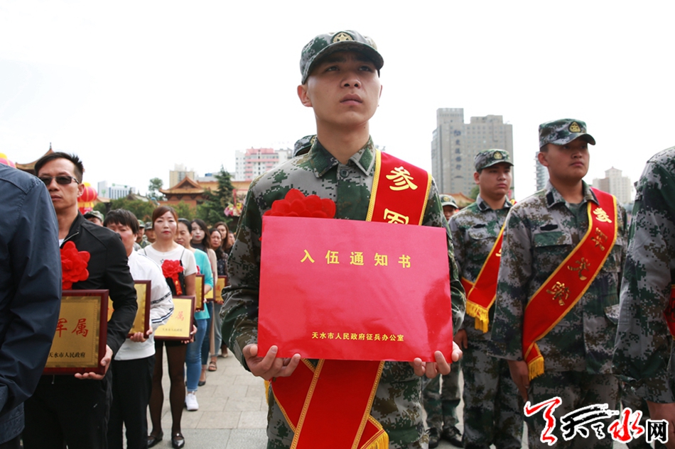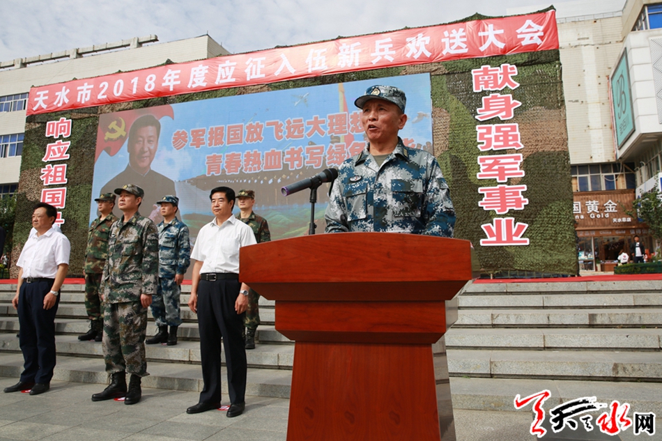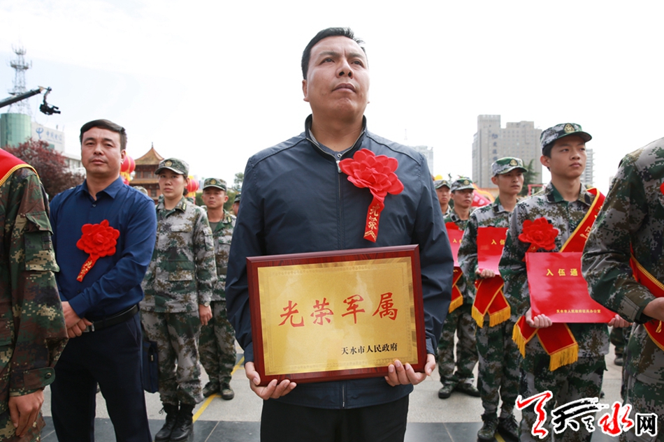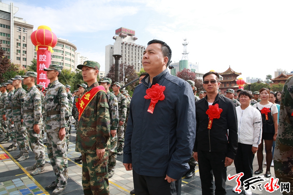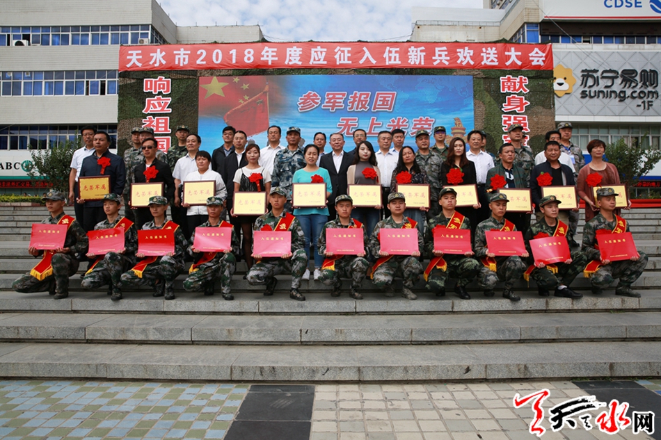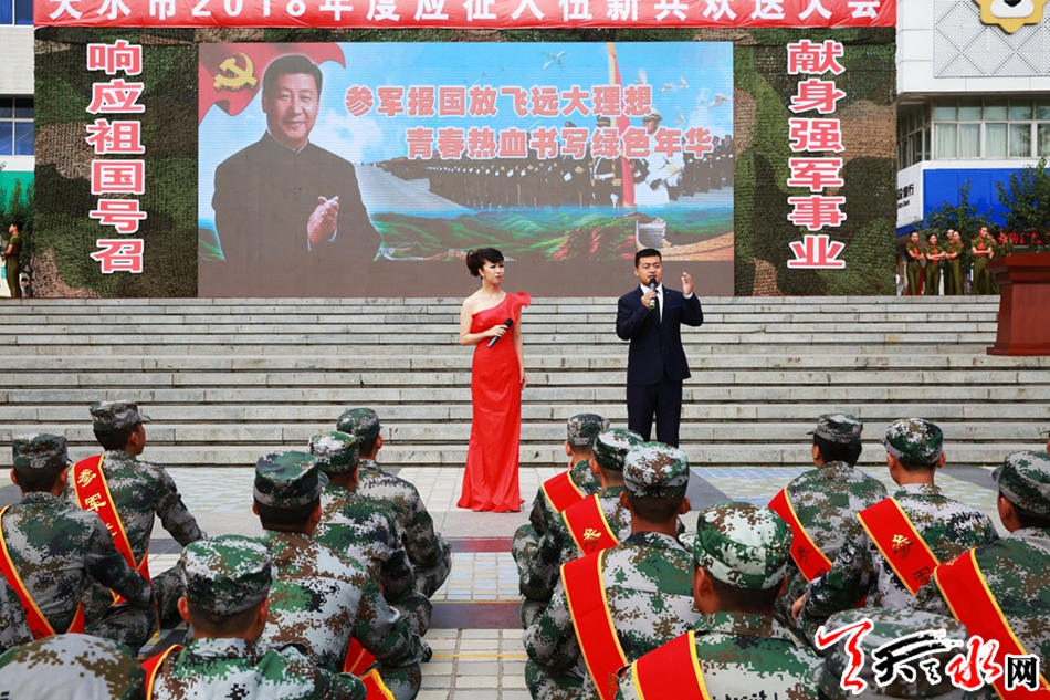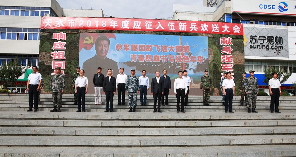 市委书记王锐,市人大常委会主任、市委秘书长蒋晓强,市委常委、副市长王洪义,天水军分区司令员刘甫清,市人大常委会副主任宋建平、市政协副主席郭明兴出席欢送大会并为入伍新兵代表及家庭颁发《光荣入伍通知书》和光荣军属牌。天水军分区政委袁敬伟主持欢送大会。