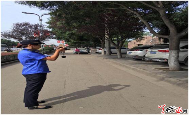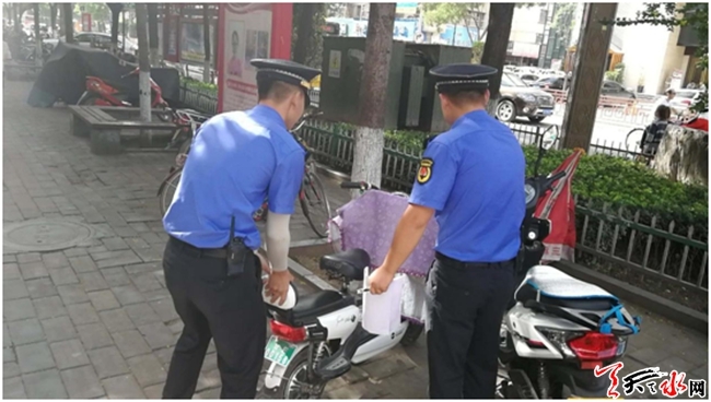在此次集中整治行动中,秦州区执法局西关中队执法队员每天从早晨7:30至晚18:00,无缝隙、无死角对解放路、双桥南北路、永庆路、成纪大道、藉河北路、女娲路、伏羲路等重点路段集中整治、重点巡查,对非机动车车停放进行分片划分,按区域整齐停放;对机动车占用人行道停放的违章车辆进行规范管理,首先告诉其违反的相关法律法规以及整治的目的,凡规划有停车位而不按指定位置停放的机动车,一律对其进行贴单。