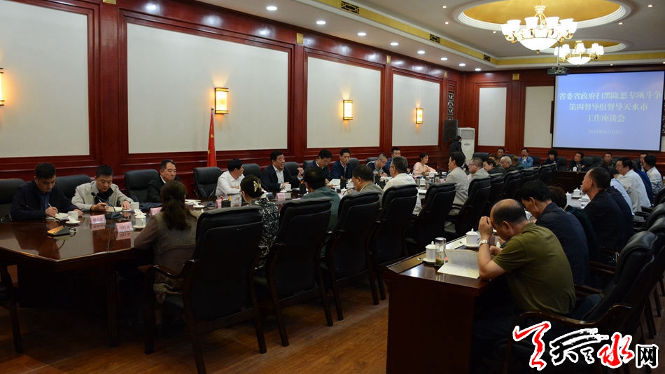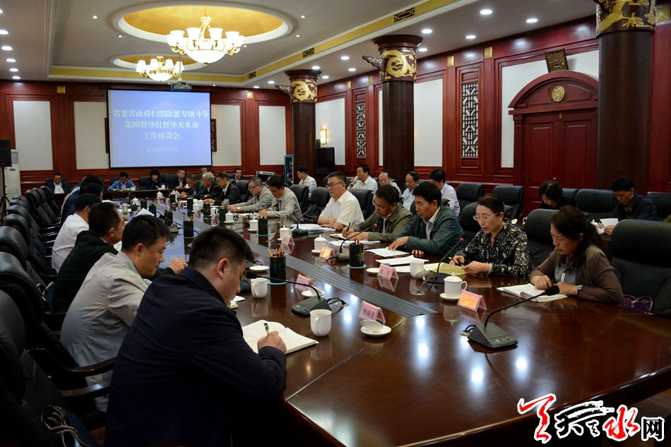 天天天水网讯【全媒体记者吴丽娜】9月10日下午,省委省政府扫黑除恶专项斗争第四督导组召开督导工作座谈会。市委常委、政法委书记、市扫黑除恶专项斗争领导小组常务副组长蒲军同志主持座谈会。省督导组成员和市扫黑除恶专项斗争领导小组成员单位主要负责同志、部分人大代表、政协委员、民主党派和群众代表参加座谈会。