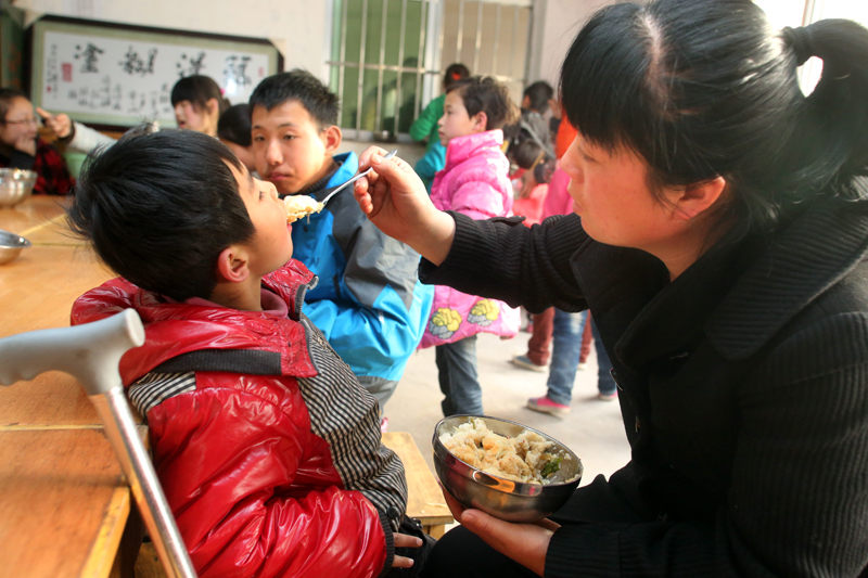 金美(化名)因病情失去吞咽功能,张小侠每天细心给她喂饭。图片来源:陕西文明网