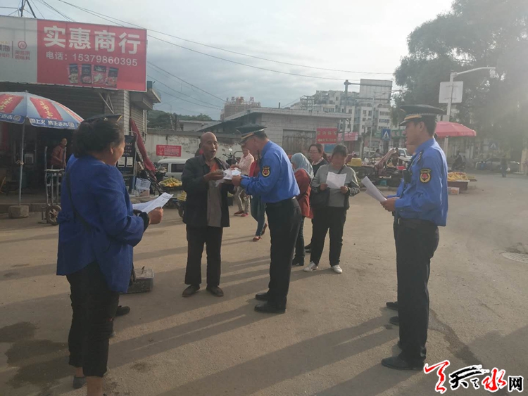 天天天水网讯(通讯员 朱学勇)为进一步加强城市市容管理,有效提升城市形象。为促进广大市民对创建全国文明城市重要意义的认识,形成全民参与、共建文明的浓厚氛围。秦州区执法局天水郡中队在辖区发放关于加强城市环境整治创建全国文明城市通告的宣传资料,面对面向市民讲解文明创建常识。