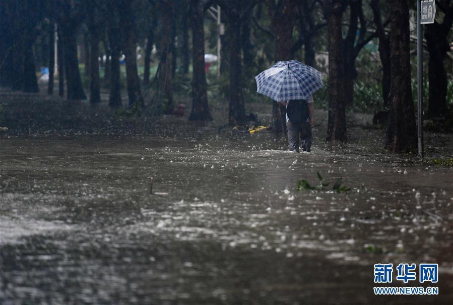 9月16日,在深圳市福田区,行人在积水的路面行走。新华社记者 毛思倩 摄