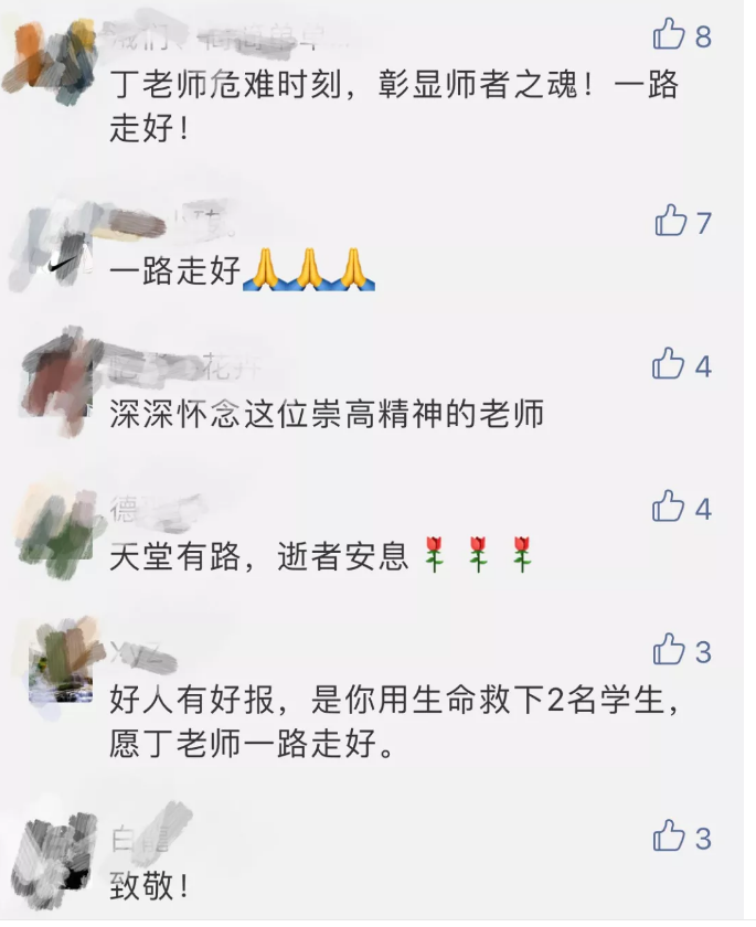 两个孩子得救了,丁老师却因伤势严重,在送医途中不治身亡。
