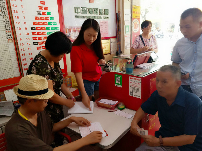姚美华(左三)指导彩民购买彩票。图片来源:广西文明网