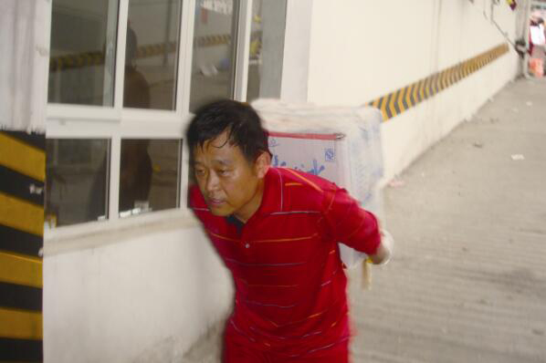 在汶川赈灾时,李万升扛着两箱救灾物资。资料图片